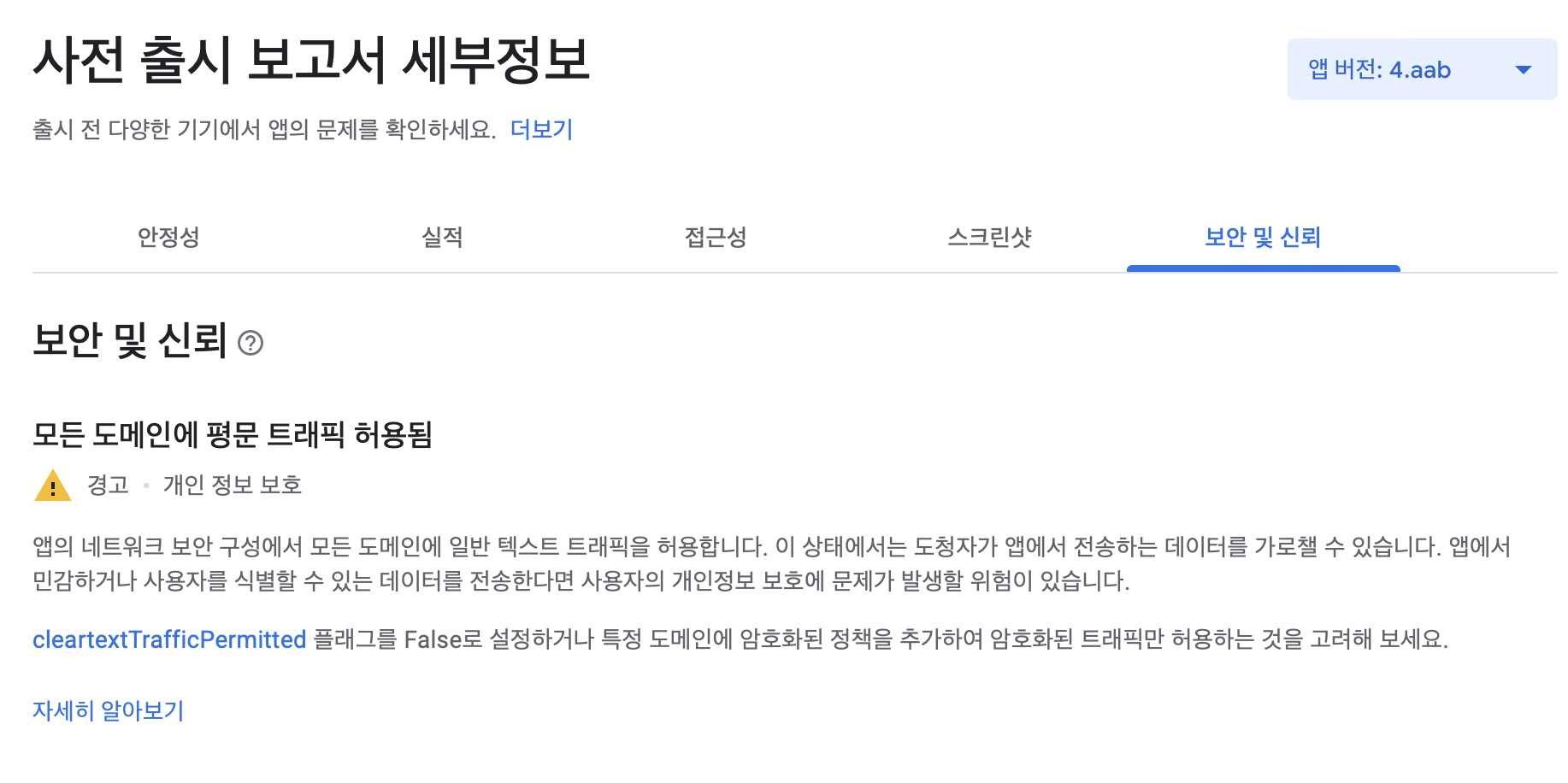 해당 내용은 Google Play Console의 내부 테스트를 돌려보고 난 후, 세부정보에서 보안 및 신뢰에 이슈가 발생하는 것을 확인할 수 있다.