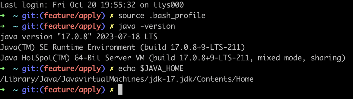 설치가 되어있거나 설치 후 Terminal에서 java - version 명령어를 사용해 확인한다.