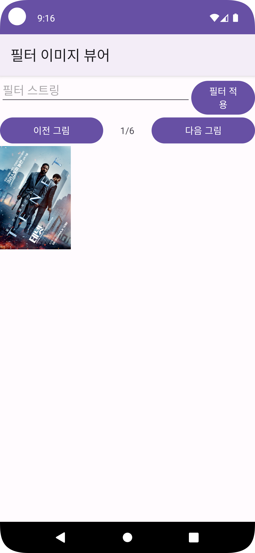 3. 상단에 String을 입력하는 EditText와 “필터 적용” Button이 표시되는데, 이 Button을 누르면 입력된 String이 파일명에 포함된 그림들만 표시된다.
