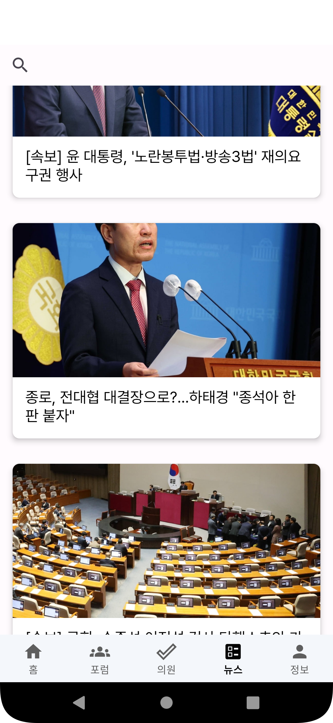 <?xml version="1.0" encoding="utf-8"?> <androidx.constraintlayout.widget.ConstraintLayout xmlns:android="http://schemas.android.com/apk/res/android" xmlns:app="http://schemas.android.com/apk/res-auto" xmlns:tools="http://schemas.android.com/tools" android:layout_width="match_parent" android:layout_height="match_parent"> <androidx.appcompat.widget.SearchView android:id="@+id/searchTextInputEditText" android:layout_width="match_parent" android:layout_height="wrap_content" android:imeOptions="actionSearch" android:inputType="text" android:maxLines="1" tools:text="테스트" tools:ignore="MissingConstraints" /> <androidx.recyclerview.widget.RecyclerView android:id="@+id/newsRecyclerView" android:layout_width="0dp" android:layout_height="0dp" app:layout_constraintBottom_toBottomOf="parent" app:layout_constraintEnd_toEndOf="parent" app:layout_constraintStart_toStartOf="parent" app:layout_constraintTop_toBottomOf="@id/searchTextInputEditText" tools:listitem="@layout/item_news" /> <com.airbnb.lottie.LottieAnimationView android:id="@+id/notFountView" android:layout_width="0dp" android:layout_height="0dp" android:visibility="gone" app:layout_constraintBottom_toBottomOf="parent" app:layout_constraintEnd_toEndOf="parent" app:layout_constraintStart_toStartOf="parent" app:layout_constraintTop_toBottomOf="@id/searchTextInputEditText" app:lottie_autoPlay="true" app:lottie_loop="true" app:lottie_rawRes="@raw/not_found" /> </androidx.constraintlayout.widget.ConstraintLayout>여기까지 정상적으로 작성했다면 다음과 같은 결과를 기대할 수 있다.
